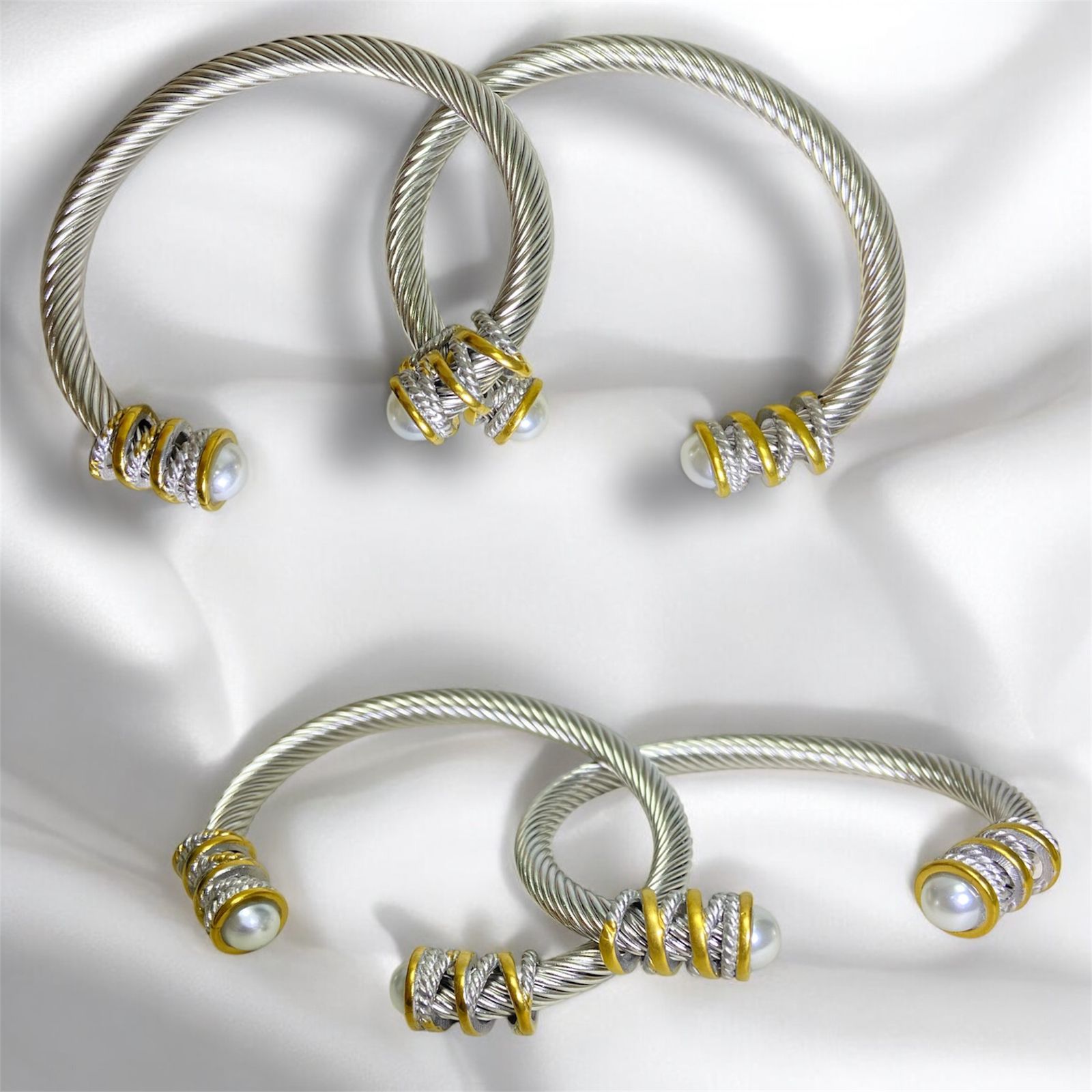 Pulsera Abierta Plateada con Perlas y Detalles Dorados | Luna Bella Joyería