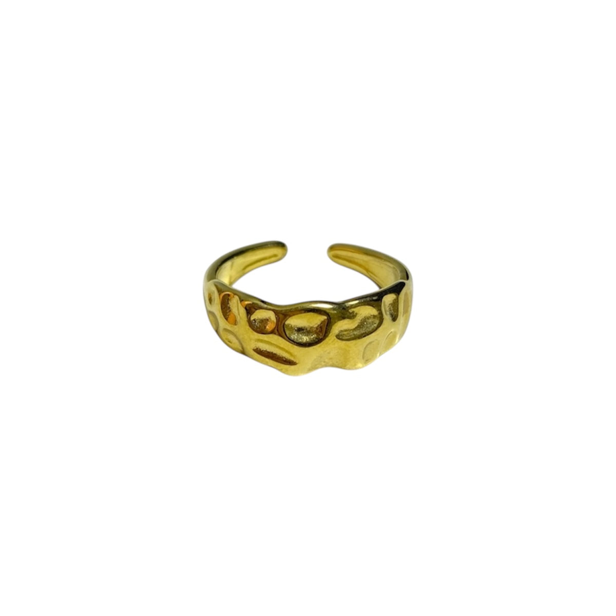 Luce un diseño moderno y con carácter con este anillo ajustable dorado de acero inoxidable con textura orgánica de Luna Bella Joyería. Su acabado martillado irregular crea un efecto visual contemporáneo y elegante, ideal para quienes buscan una pieza diferente que destaque sin perder sofisticación.